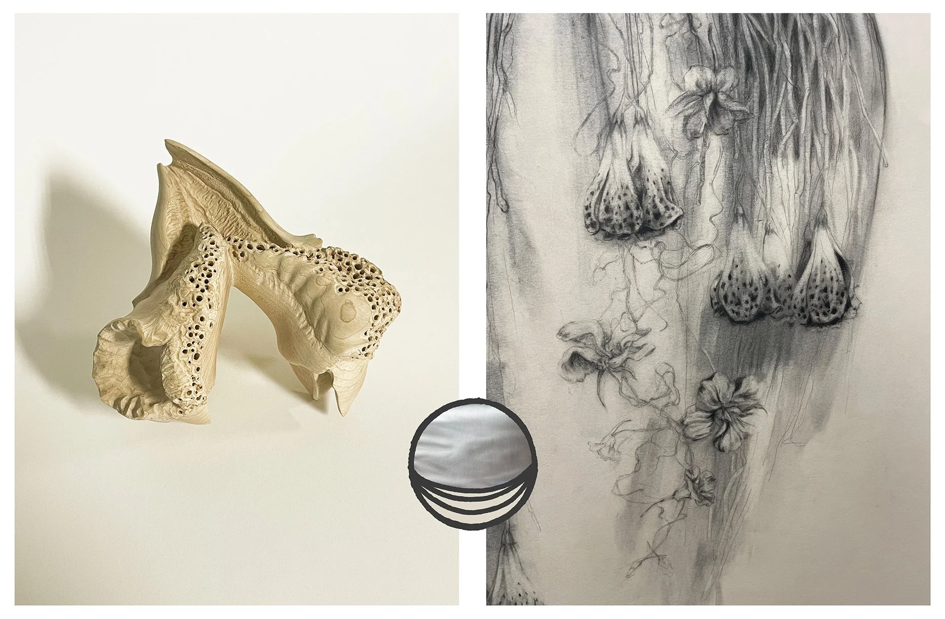 The exhibit features a series of trios: a drawing and sculpture, each with a perfume that further hybridizes the pair in the form of an alchemical third. Viewers are invited to smell, engaging in deeper intimacy with the visual art. Each work and each “collection” stands alone but also communicates with and complements every other. Similar to the exquisite corpse, these hybrids are both familiar and deviant. Grotesque, surreal, and, because they are made with intention, elegant.